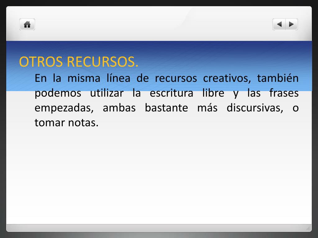 OTROS RECURSOS. En la misma línea de recursos creativos, también podemos utilizar la escritura libre y las frases empezadas, ambas bastante más discursivas, o tomar notas.