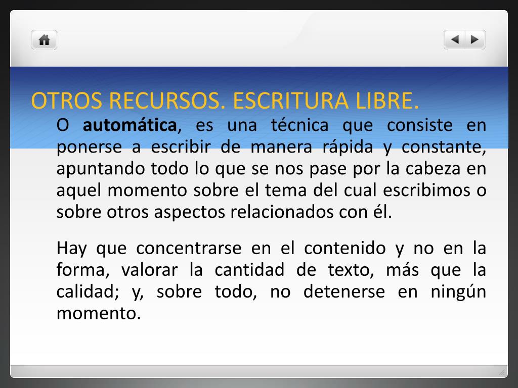 OTROS RECURSOS. ESCRITURA LIBRE. O automática, es una técnica que consiste en ponerse a escribir de manera rápida y constante, apuntando todo lo que se nos pase por la cabeza en aquel momento sobre el tema del cual escribimos o sobre otros aspectos relacionados con él. Hay que concentrarse en el contenido y no en la forma, valorar la cantidad de texto, más que la calidad; y, sobre todo, no detenerse en ningún momento.