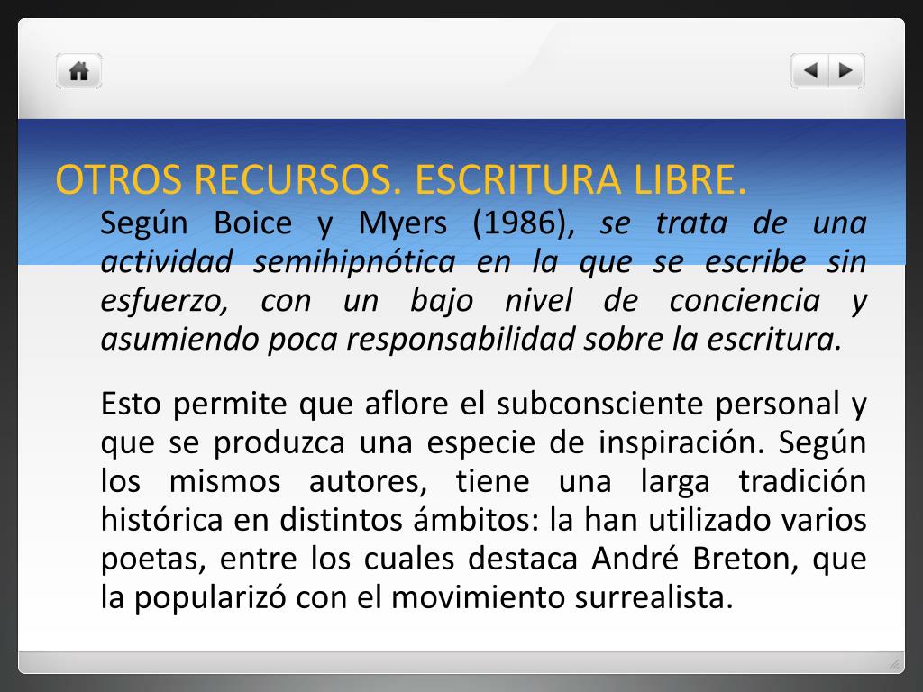 OTROS RECURSOS. ESCRITURA LIBRE. Según Boice y Myers (1986), se trata de una actividad semihipnótica en la que se escribe sin esfuerzo, con un bajo nivel de conciencia y asumiendo poca responsabilidad sobre la escritura. Esto permite que aflore el subconsciente personal y que se produzca una especie de inspiración. Según los mismos autores, tiene una larga tradición histórica en distintos ámbitos: la han utilizado varios poetas, entre los cuales destaca André Breton, que la popularizó con el movimiento surrealista.