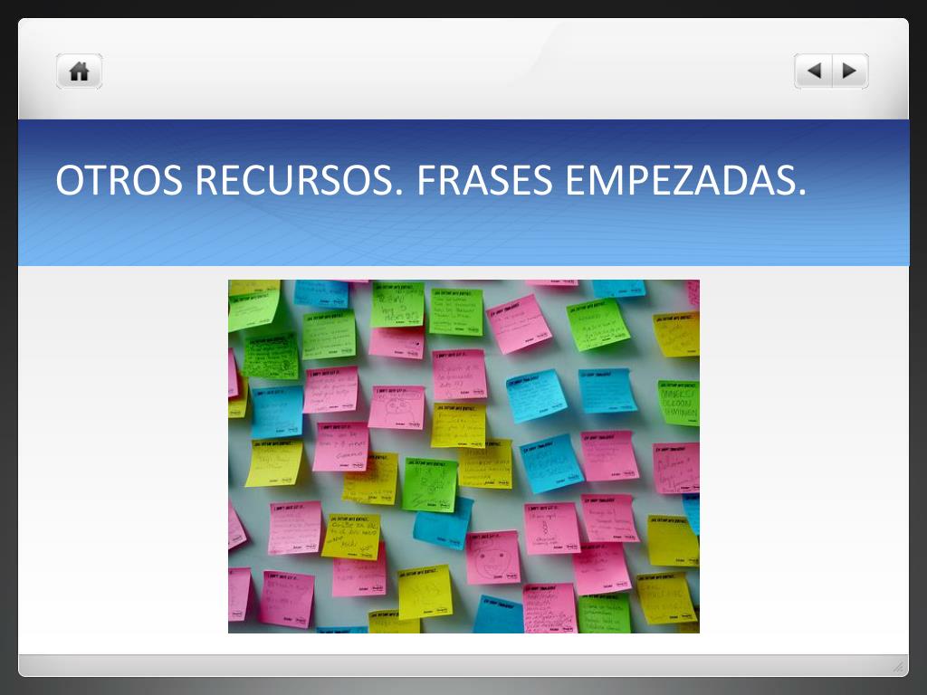 OTROS RECURSOS. FRASES EMPEZADAS. Las frases empezadas son bastante más concretas que el torbellino de ideas o la escritura automática, y por esto pueden ser más útiles a los aprendices que se sientan desorientados con las técnicas demasiado abiertas. Además, dirigen la atención del autor hacia el propósito y los puntos más importantes de la comunicación.
