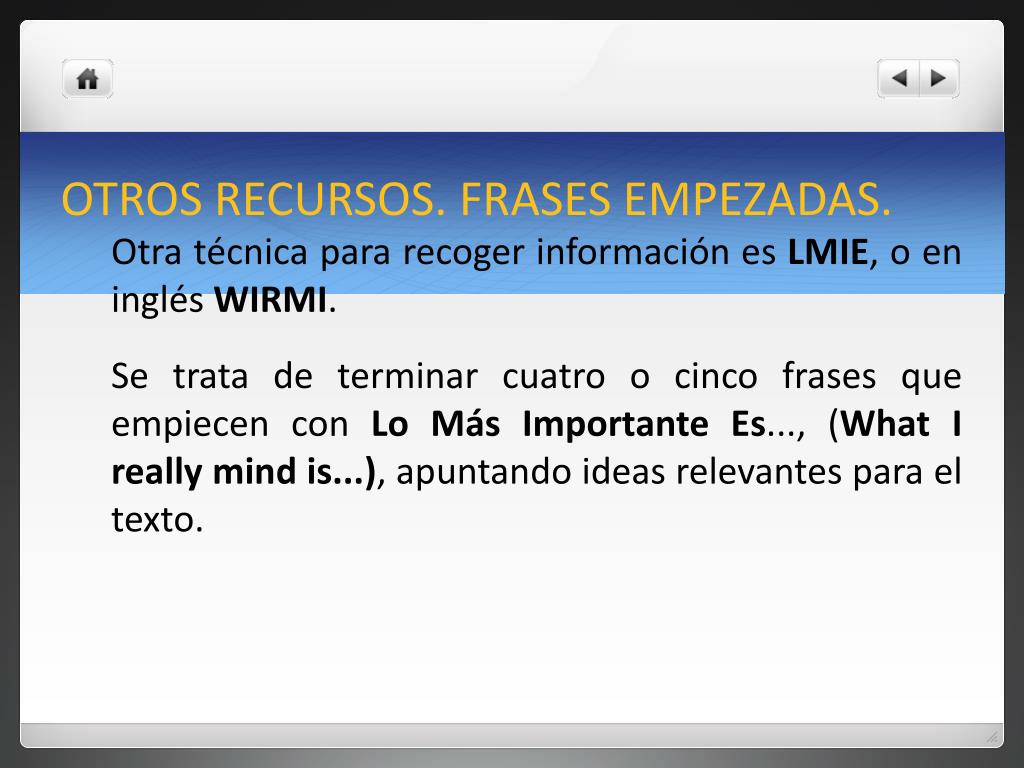 OTROS RECURSOS. FRASES EMPEZADAS. Otra técnica para recoger información es LMIE, o en inglés WIRMI. Se trata de terminar cuatro o cinco frases que empiecen con Lo Más Importante Es..., (What I really mind is...), apuntando ideas relevantes para el texto.