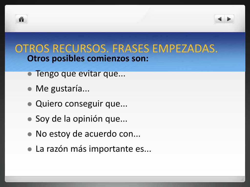 OTROS RECURSOS. FRASES EMPEZADAS. Otros posibles comienzos son: • Tengo que evitar que... • Me gustaría... • Quiero conseguir que... • Soy de la opinión que... • No estoy de acuerdo con... • La razón más importante es...