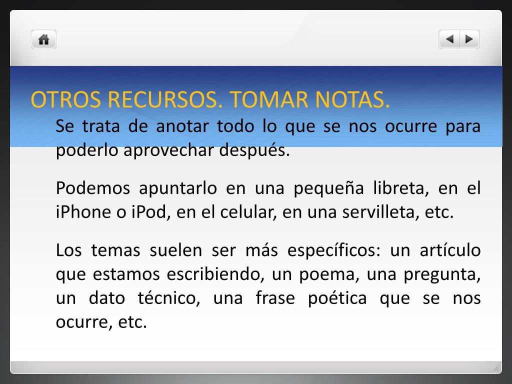 OTROS RECURSOS. TOMAR NOTAS. Se trata de anotar todo lo que se nos ocurre para poderlo aprovechar después. Podemos apuntarlo en una pequeña libreta, en el iPhone o iPod, en el celular, en una servilleta, etc. Los temas suelen ser más específicos: un artículo que estamos escribiendo, un poema, una pregunta, un dato técnico, una frase poética que se nos ocurre, etc.