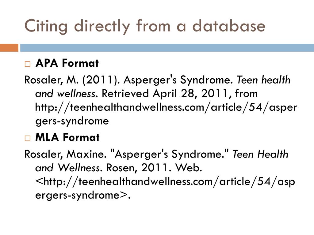 Citing directly from a database • APA Format Rosaler, M. (2011). Asperger's Syndrome. Teen health and wellness. Retrieved April 28, 2011, from http://teenhealthandwellness.com/article/54/aspergers-syndrome • MLA Format Rosaler, Maxine. "Asperger's Syndrome." Teen Health and Wellness. Rosen, 2011. Web. <http://teenhealthandwellness.com/article/54/aspergers-syndrome>.