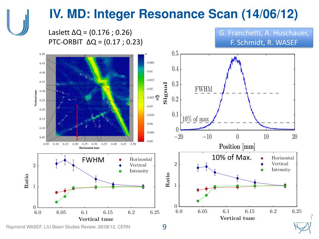 IV. MD: Integer Resonance Scan (14/06/12) Laslett ΔQ = (0.176 ; 0.26)PTC-ORBIT ΔQ = (0.17 ; 0.23) G. Franchetti, A. Huschauer, F. Schmidt, R. WASEF 10% of Max. FWHM 9