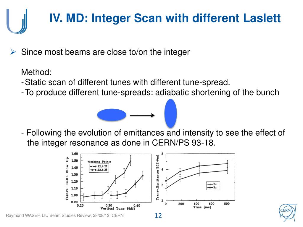 IV. MD: Integer Scan with different Laslett • Since most beams are close to/on the integerMethod:- Static scan of different tunes with different tune-spread. - To produce different tune-spreads: adiabatic shortening of the bunch- Following the evolution of emittances and intensity to see the effect of the integer resonance as done in CERN/PS 93-18. 12