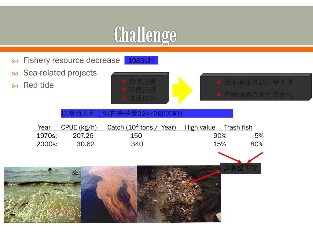 Challenge • Fishery resource decrease • Sea-related projects • Red tide 1980s起 • 捕捞过度 • 环境污染 • 作业破坏 • 近海渔业资源质量下降 • 产卵场栖息地生态恶化 以南海为例(潜在渔获量224~260万吨): YearCPUE (kg/h) Catch (104 tons / Year) High valueTrash fish 1970s: 207.26 150 90%5% 2000s: 30.62 340 15%80% 营养级下降
