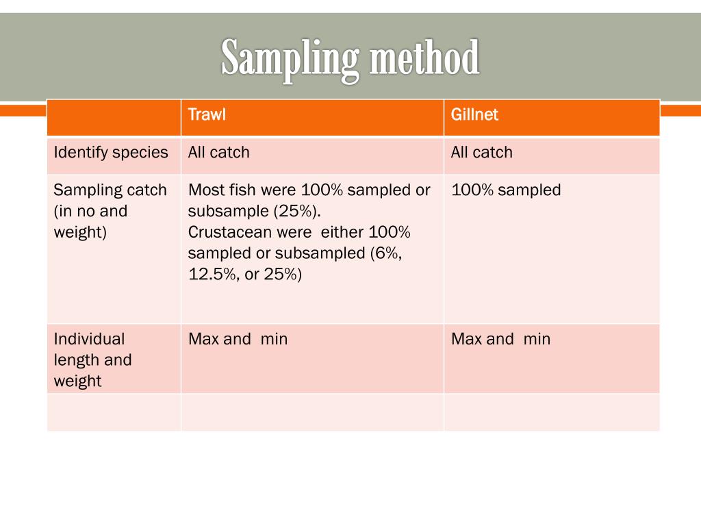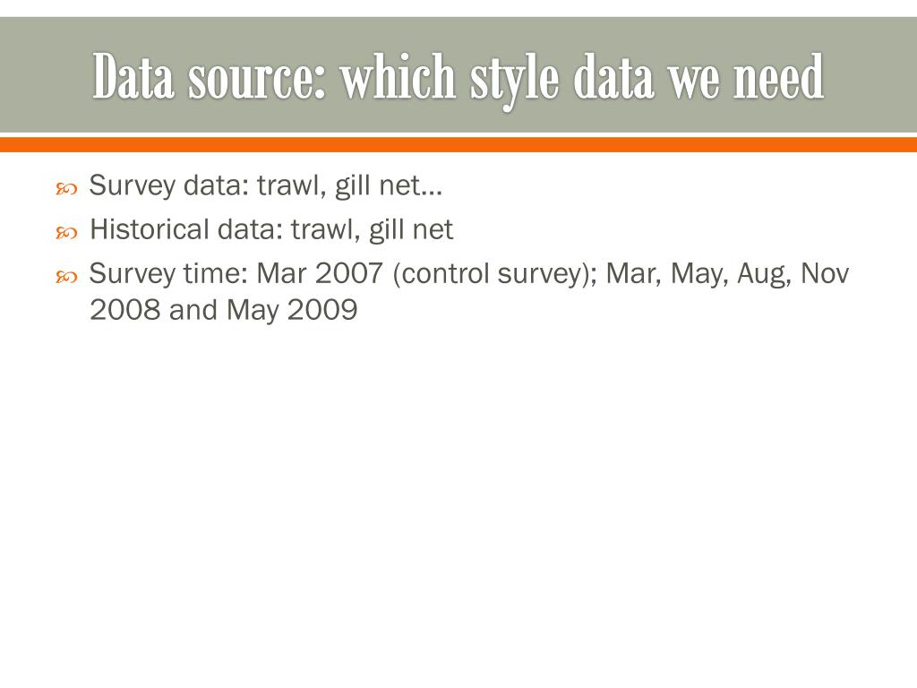 Data source: which style data we need • Survey data: trawl, gill net… • Historical data: trawl, gill net • Survey time: Mar 2007 (control survey); Mar, May, Aug, Nov 2008 and May 2009