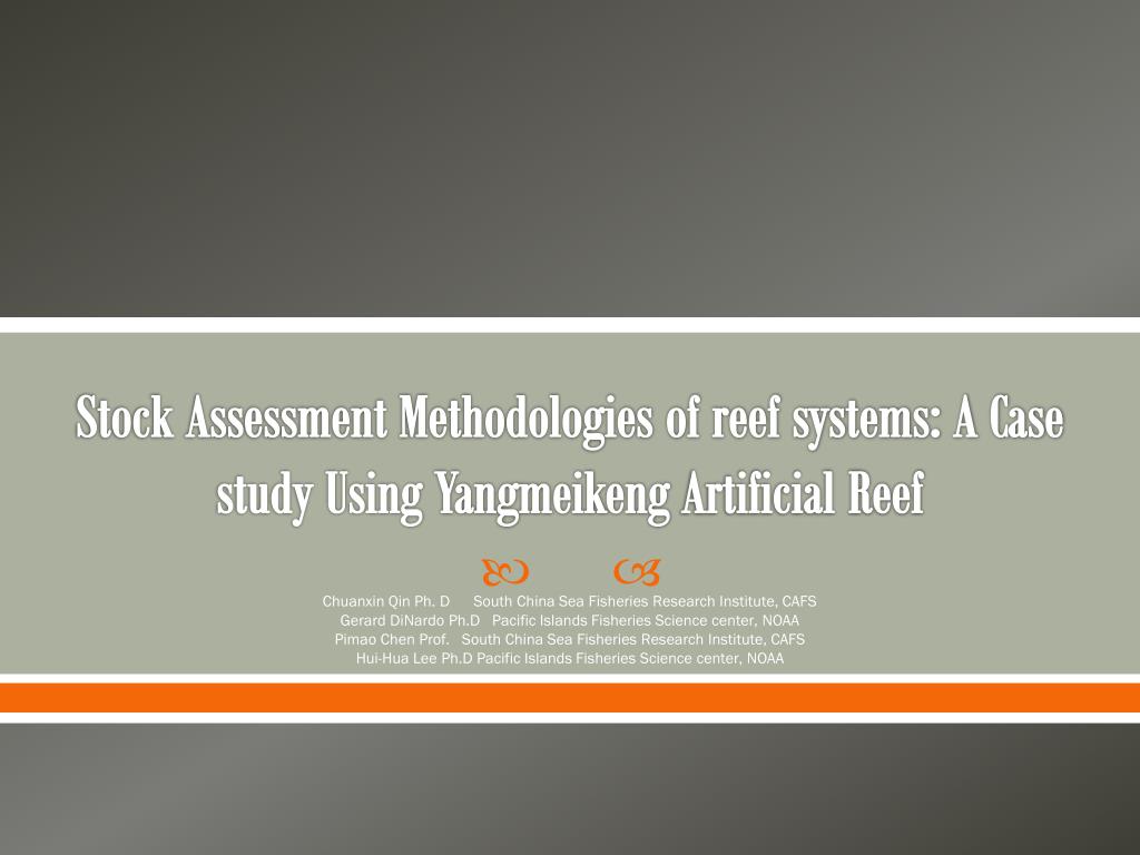 Stock Assessment Methodologies of reef systems: A Case study Using Yangmeikeng Artificial Reef Chuanxin Qin Ph. D South China Sea Fisheries Research Institute, CAFS Gerard DiNardoPh.D Pacific Islands Fisheries Science center, NOAA Pimao Chen Prof. South China Sea Fisheries Research Institute, CAFS Hui-HuaLee Ph.D Pacific Islands Fisheries Science center, NOAA