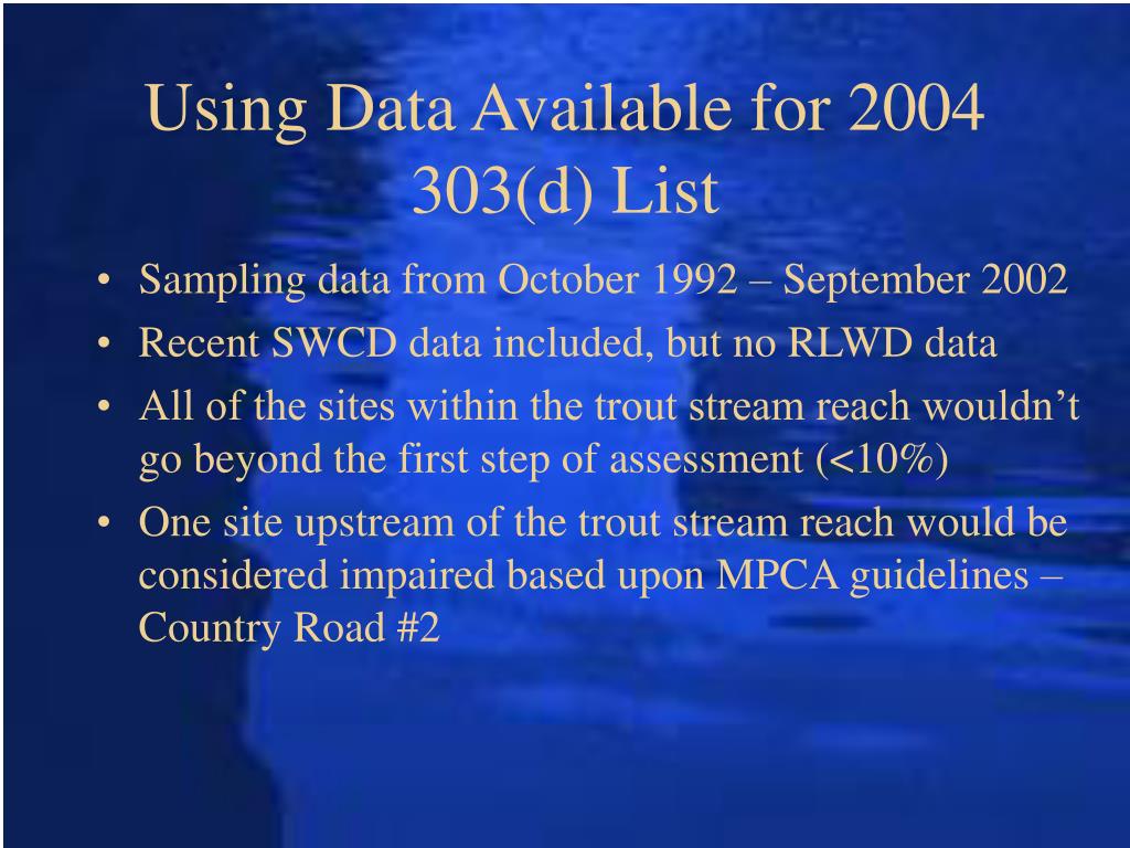 Using Data Available for 2004 303(d) List • Sampling data from October 1992 – September 2002 • Recent SWCD data included, but no RLWD data • All of the sites within the trout stream reach wouldn’t go beyond the first step of assessment (<10%) • One site upstream of the trout stream reach would be considered impaired based upon MPCA guidelines – Country Road #2