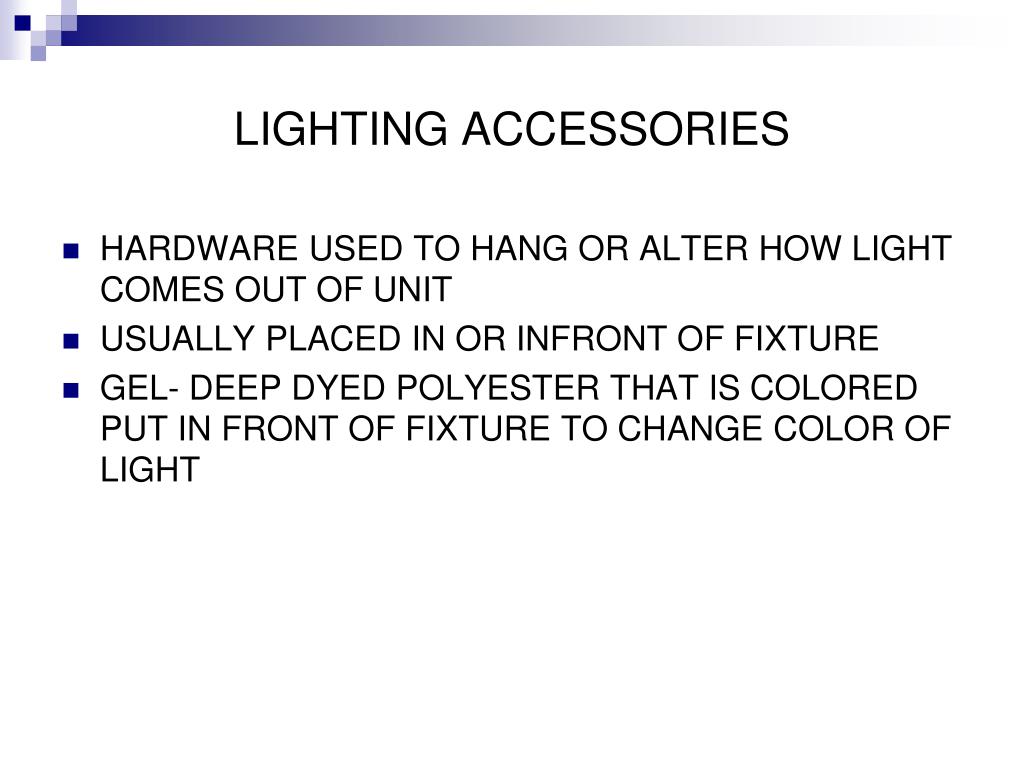 LIGHTING ACCESSORIES • HARDWARE USED TO HANG OR ALTER HOW LIGHT COMES OUT OF UNIT • USUALLY PLACED IN OR INFRONT OF FIXTURE • GEL- DEEP DYED POLYESTER THAT IS COLORED PUT IN FRONT OF FIXTURE TO CHANGE COLOR OF LIGHT