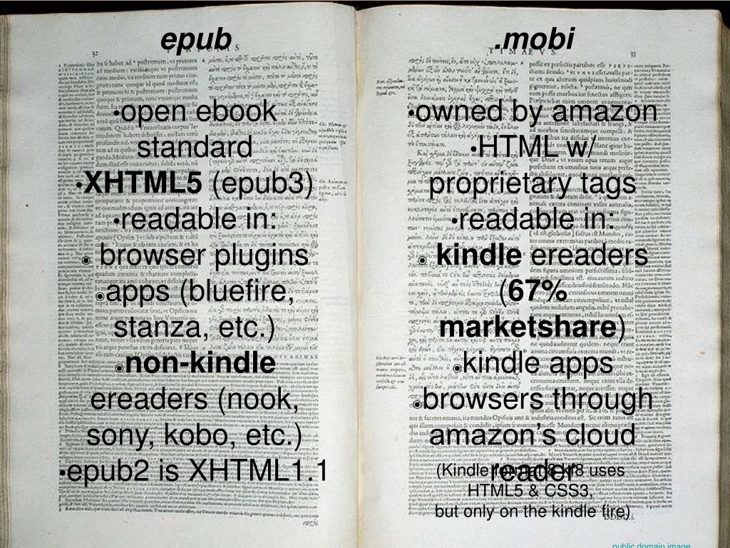 epub • open ebook standard • XHTML5 (epub3) • readable in: • browser plugins • apps (bluefire, stanza, etc.) • non-kindle ereaders (nook, sony, kobo, etc.) • epub2 is XHTML1.1 • .mobi • owned by amazon • HTML w/ proprietary tags • readable in: • kindle ereaders (67% marketshare) • kindle apps • browsers through amazon’s cloud reader (Kindle format 8 kf8 uses HTML5 & CSS3, but only on the kindle fire) public domain image