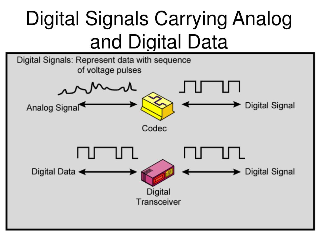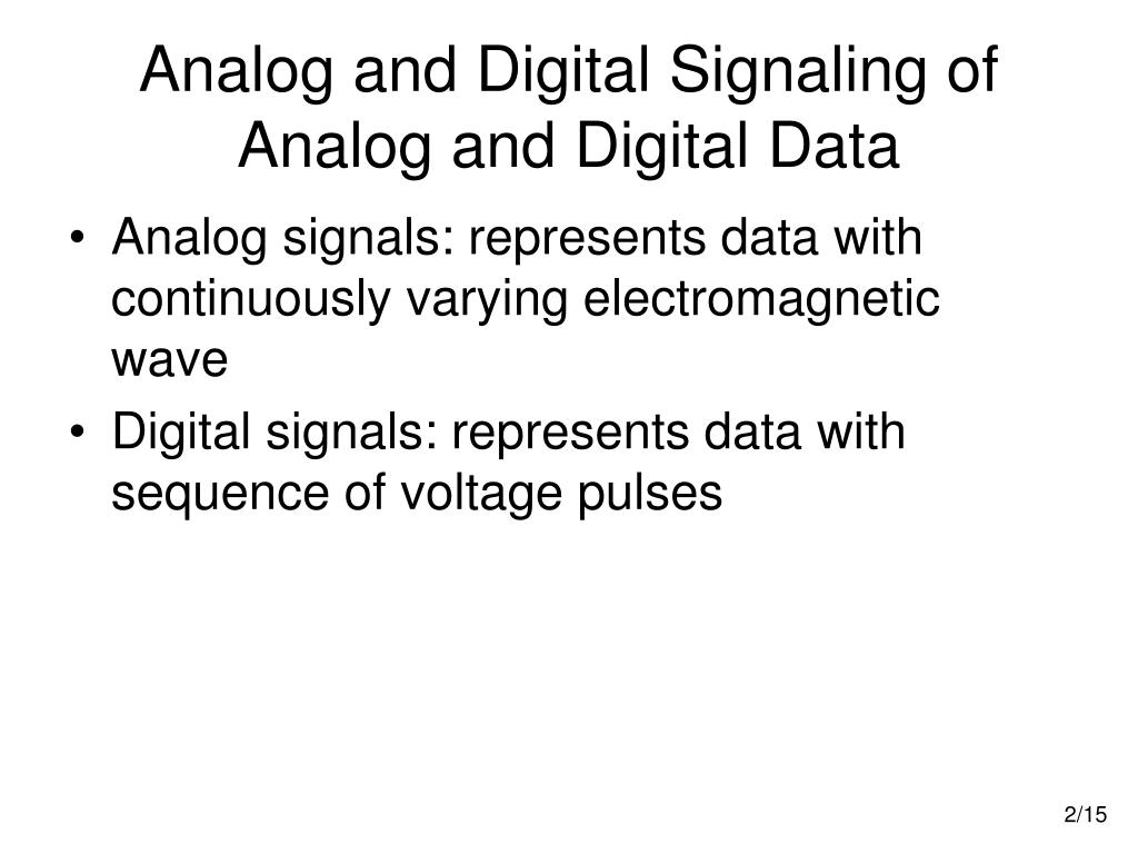 Analog and Digital Signaling of Analog and Digital Data • Analog signals: represents data with continuously varying electromagnetic wave • Digital signals: represents data with sequence of voltage pulses
