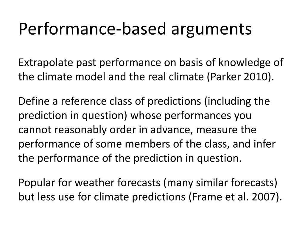 Performance-based arguments Extrapolate past performance on basis of knowledge of the climate model and the real climate (Parker 2010). Define a reference class of predictions (including the prediction in question) whose performances you cannot reasonably order in advance, measure the performance of some members of the class, and infer the performance of the prediction in question. Popular for weather forecasts (many similar forecasts) but less use for climate predictions (Frame et al. 2007).