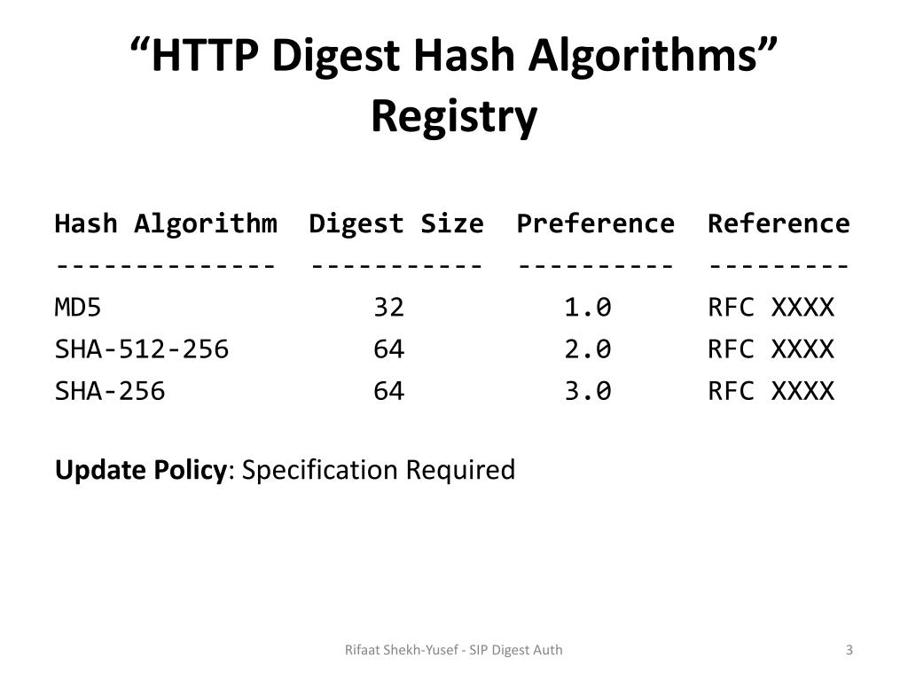 “HTTP Digest Hash Algorithms”Registry Hash AlgorithmDigest Size Preference Reference -------------- ----------- ---------- --------- MD5 32 1.0 RFC XXXX SHA-512-256 64 2.0 RFC XXXX SHA-256 64 3.0 RFC XXXX Update Policy: Specification Required Rifaat Shekh-Yusef - SIP Digest Auth