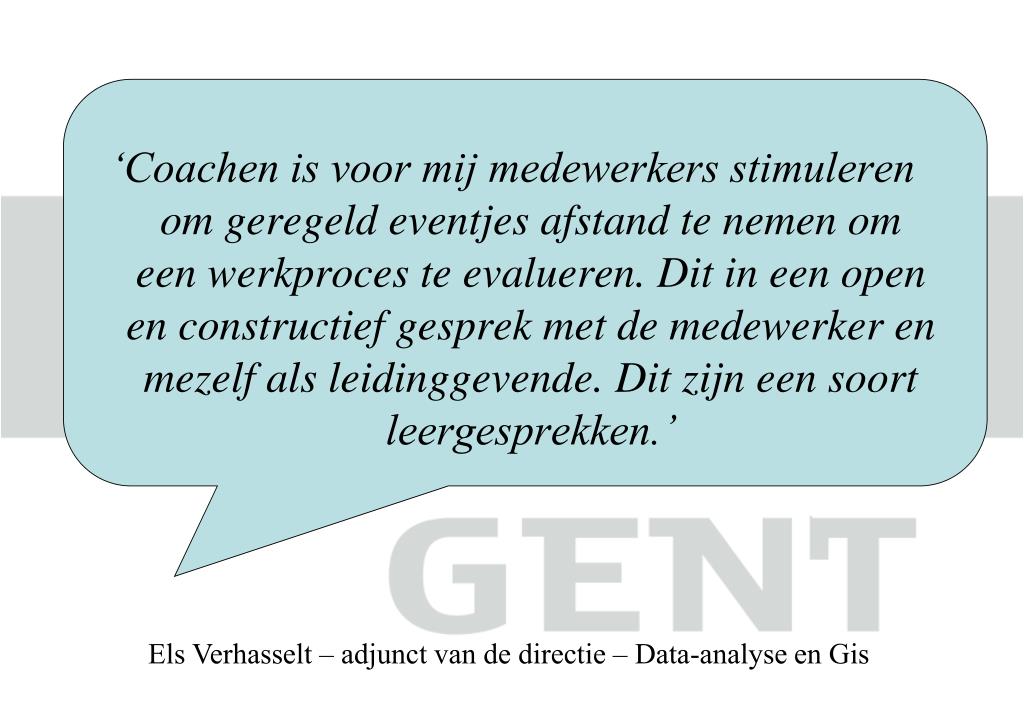 ‘Coachen is voor mij medewerkers stimuleren om geregeld eventjes afstand te nemen om een werkproces te evalueren. Dit in een open en constructief gesprek met de medewerker en mezelf als leidinggevende. Dit zijn een soort leergesprekken.’ Els Verhasselt – adjunct van de directie – Data-analyse en Gis