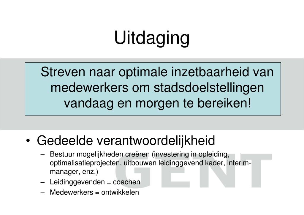 Uitdaging Streven naar optimale inzetbaarheid van medewerkers om stadsdoelstellingen vandaag en morgen te bereiken! • Gedeelde verantwoordelijkheid • Bestuur mogelijkheden creëren (investering in opleiding, optimalisatieprojecten, uitbouwen leidinggevend kader, interim-manager, enz.) • Leidinggevenden = coachen • Medewerkers = ontwikkelen