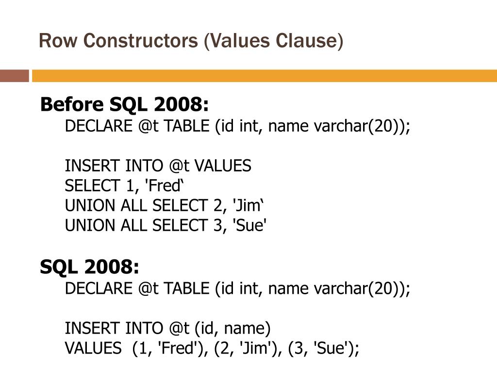 Row Constructors (Values Clause) • Before SQL 2008: • DECLARE @t TABLE (id int, name varchar(20)); • INSERT INTO @t VALUES • SELECT 1, 'Fred‘ • UNION ALL SELECT 2, 'Jim‘ • UNION ALL SELECT 3, 'Sue' • SQL 2008: • DECLARE @t TABLE (id int, name varchar(20)); • INSERT INTO @t (id, name) • VALUES (1, 'Fred'), (2, 'Jim'), (3, 'Sue');