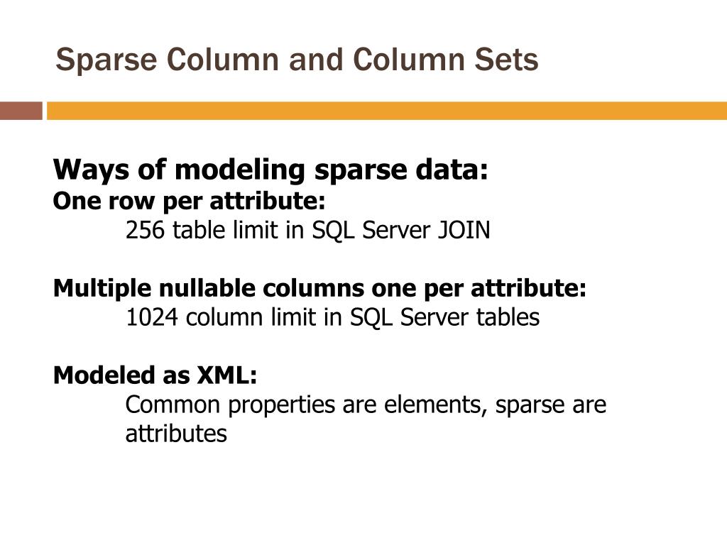 Sparse Column and Column Sets • Ways of modeling sparse data: • One row per attribute: • 256 table limit in SQL Server JOIN • Multiple nullable columns one per attribute: • 1024 column limit in SQL Server tables • Modeled as XML: • Common properties are elements, sparse are attributes