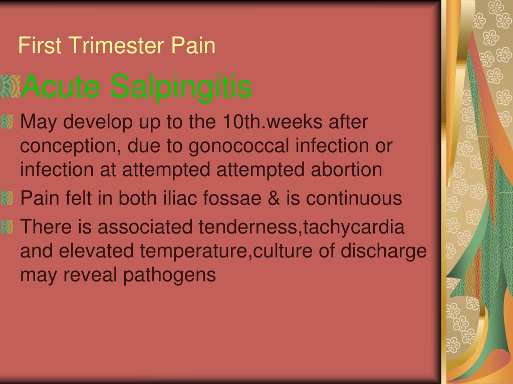 First Trimester Pain • Acute Salpingitis • May develop up to the 10th.weeks after conception, due to gonococcal infection or infection at attempted attempted abortion • Pain felt in both iliac fossae & is continuous • There is associated tenderness,tachycardia and elevated temperature,culture of discharge may reveal pathogens