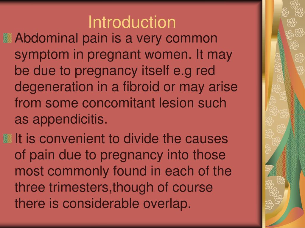 Introduction • Abdominal pain is a very common symptom in pregnant women. It may be due to pregnancy itself e.g red degeneration in a fibroid or may arise from some concomitant lesion such as appendicitis. • It is convenient to divide the causes of pain due to pregnancy into those most commonly found in each of the three trimesters,though of course there is considerable overlap.