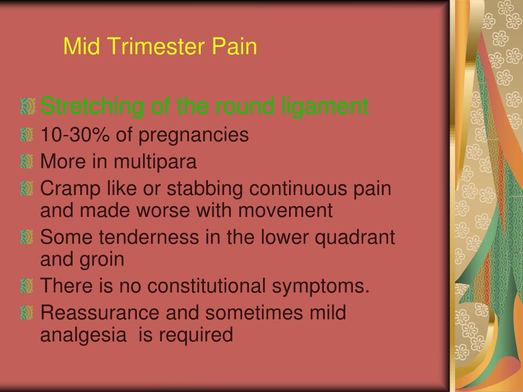 Mid Trimester Pain • Stretching of the round ligament • 10-30% of pregnancies • More in multipara • Cramp like or stabbing continuous pain and made worse with movement • Some tenderness in the lower quadrant and groin • There is no constitutional symptoms. • Reassurance and sometimes mild analgesia is required
