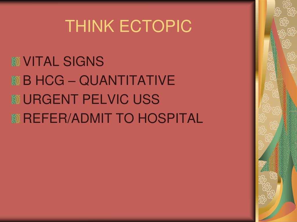 THINK ECTOPIC • VITAL SIGNS • B HCG – QUANTITATIVE • URGENT PELVIC USS • REFER/ADMIT TO HOSPITAL
