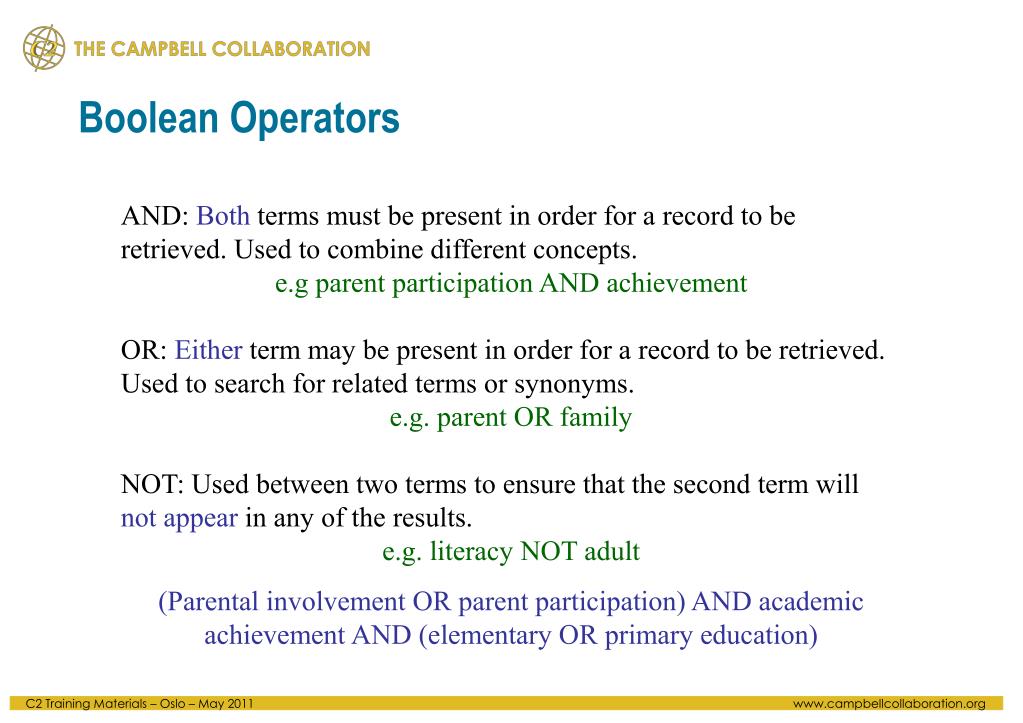 Boolean Operators AND: Both terms must be present in order for a record to be retrieved. Used to combine different concepts. e.g parent participation AND achievement OR: Either term may be present in order for a record to be retrieved. Used to search for related terms or synonyms. e.g. parent OR family NOT: Used between two terms to ensure that the second term will not appear in any of the results. e.g. literacy NOT adult (Parental involvement OR parent participation) AND academic achievement AND (elementary OR primary education)