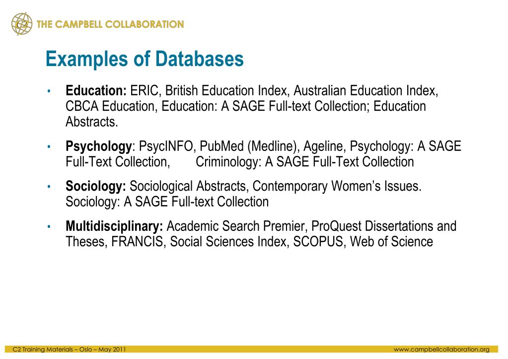 Examples of Databases • Education: ERIC, British Education Index, Australian Education Index, CBCA Education, Education: A SAGE Full-text Collection; Education Abstracts. • Psychology: PsycINFO, PubMed (Medline), Ageline, Psychology: A SAGE Full-Text Collection, Criminology: A SAGE Full-Text Collection • Sociology: Sociological Abstracts, Contemporary Women’s Issues. Sociology: A SAGE Full-text Collection • Multidisciplinary: Academic Search Premier, ProQuest Dissertations and Theses, FRANCIS, Social Sciences Index, SCOPUS, Web of Science