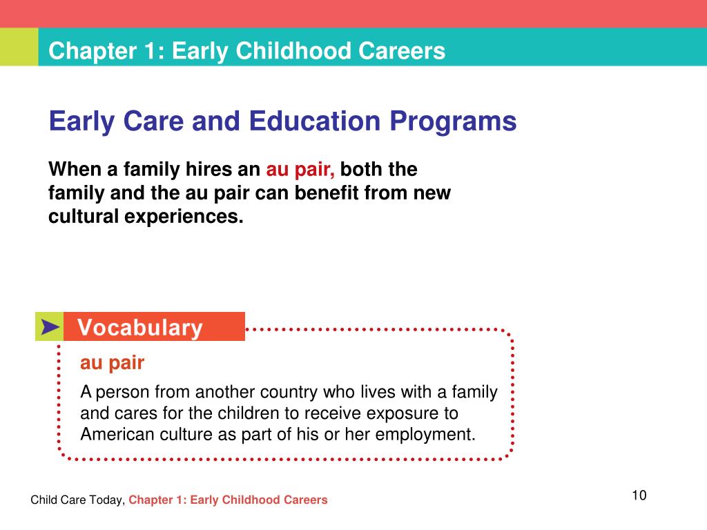 Chapter 1:Early Childhood Careers Early Care and Education Programs When a family hires anau pair, both thefamily and the au pair can benefit from new cultural experiences. Child Care Today,Chapter 1: Early Childhood Careers au pair A person from another country who lives with a family and cares for the children to receive exposure to American culture as part of his or her employment.