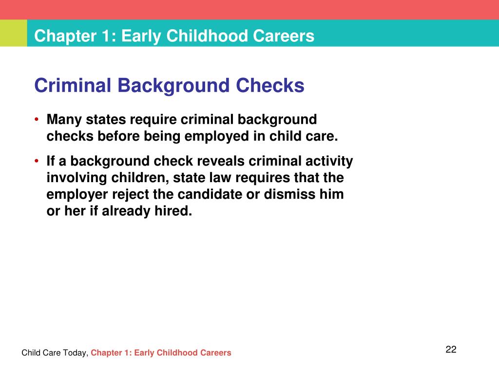 Chapter 1:Early Childhood Careers Criminal Background Checks • Many states require criminal background checks before being employed in child care. • If a background check reveals criminal activity involving children, state law requires that the employer reject the candidate or dismiss him or her if already hired. Child Care Today,Chapter 1: Early Childhood Careers