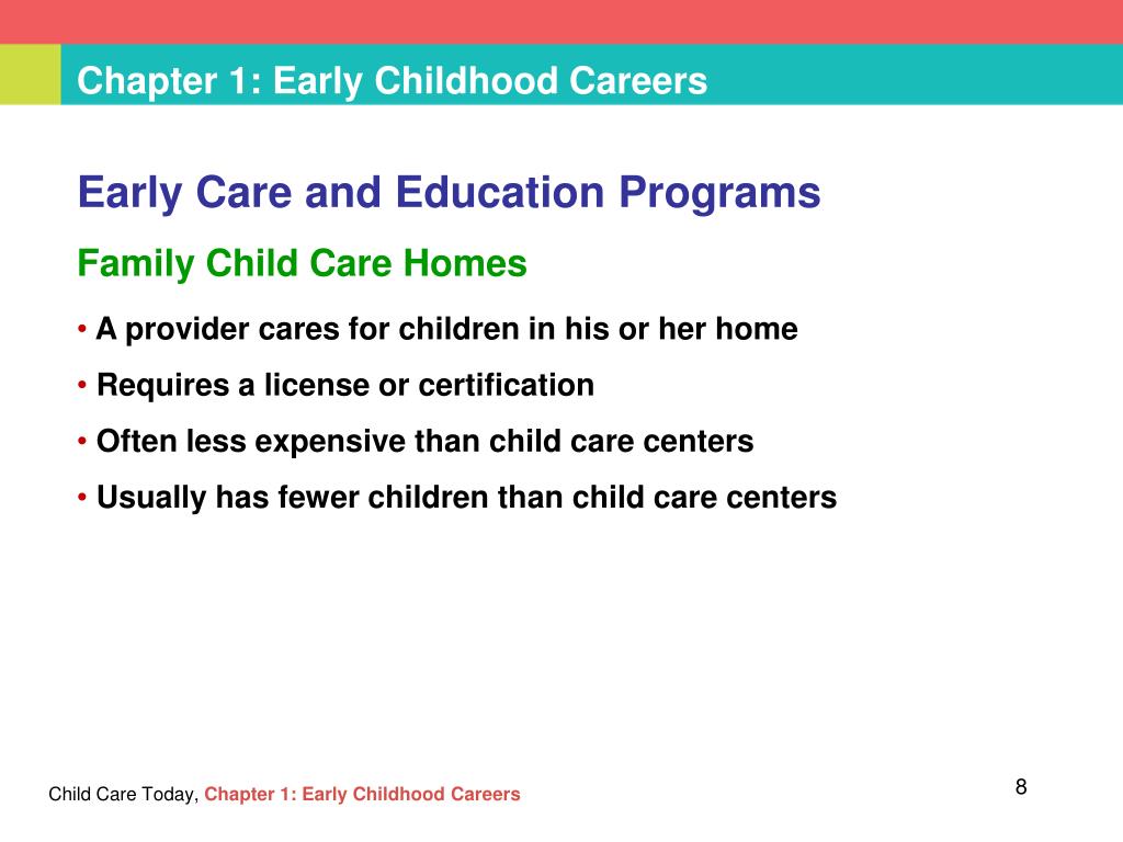 Chapter 1:Early Childhood Careers Early Care and Education Programs Family Child Care Homes Child Care Today,Chapter 1: Early Childhood Careers • A provider cares for children in his or her home • Requires a license or certification • Often less expensive than child care centers • Usually has fewer children than child care centers