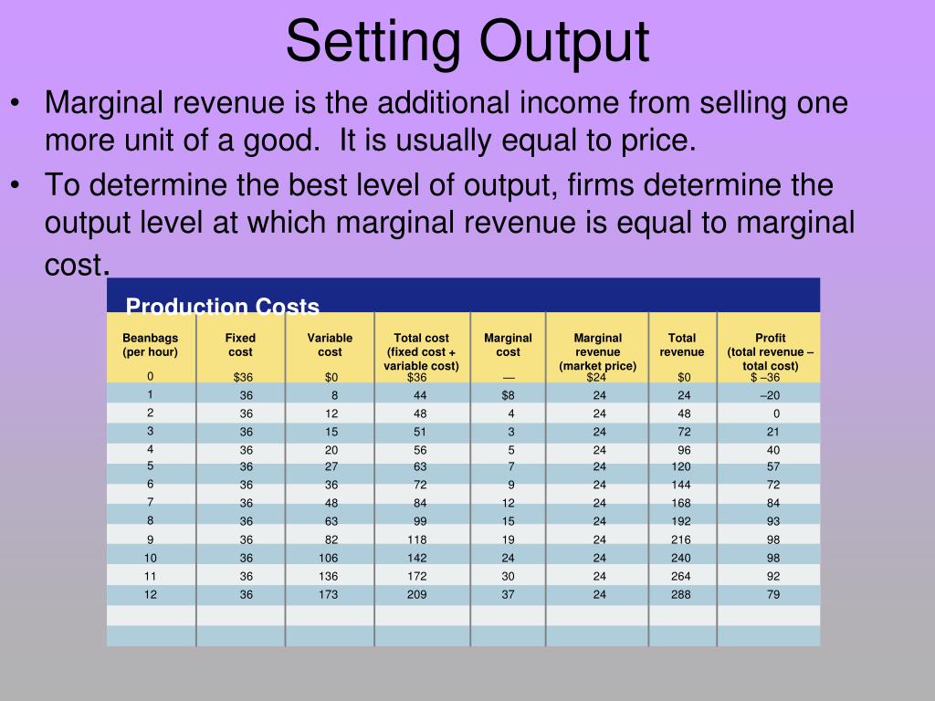 Production Costs Beanbags (per hour) Fixed cost Variable cost Total cost (fixed cost + variable cost) Marginal cost Marginal revenue (market price) Total revenue Profit(total revenue – total cost) 0 1 2 3 4 $36 36 36 36 36 $0 8 12 15 20 $36 44 48 51 56 — $8 4 3 5 $24 24 24 24 24 $0 24 48 72 96 $ –36 –20 0 21 40 5 6 7 8 36 36 36 36 27 36 48 63 63 72 84 99 7 9 12 15 24 24 24 24 120 144 168 192 57 72 84 93 9 10 11 12 36 36 36 36 82 106 136 173 118 142 172 209 19 24 30 37 24 24 24 24 216 240 264 288 98 98 92 79 Setting Output • Marginal revenue is the additional income from selling one more unit of a good. It is usually equal to price. • To determine the best level of output, firms determine the output level at which marginal revenue is equal to marginal cost.