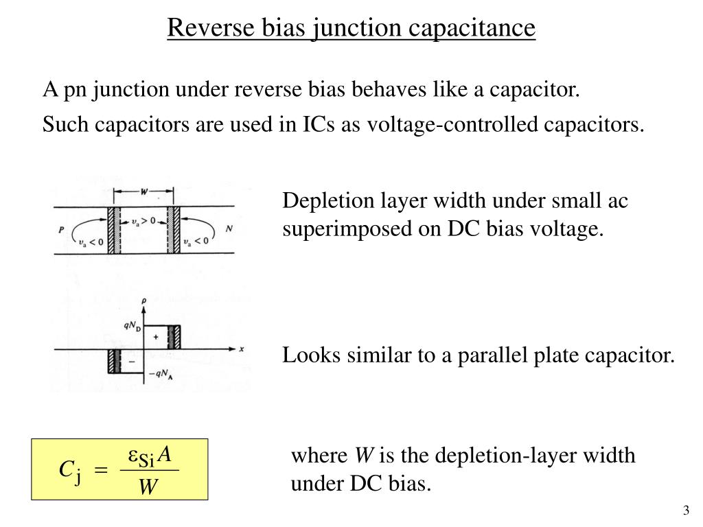 Reverse bias junction capacitance A pn junction under reverse bias behaves like a capacitor. Such capacitors are used in ICs as voltage-controlled capacitors. Depletion layer width under small ac superimposed on DC bias voltage. Looks similar to a parallel plate capacitor. where W is the depletion-layer width under DC bias.