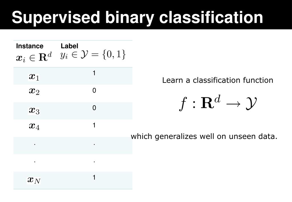 Supervised binary classification Learn a classification function which generalizes well on unseen data.