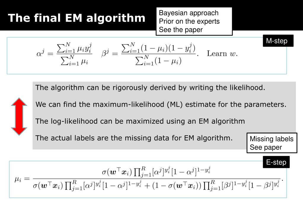 Bayesian approach Prior on the experts See the paper The final EM algorithm M-step The algorithm can be rigorously derived by writing the likelihood. We can find the maximum-likelihood (ML) estimate for the parameters. The log-likelihood can be maximized using an EM algorithm The actual labels are the missing data for EM algorithm. Missing labels See paper E-step