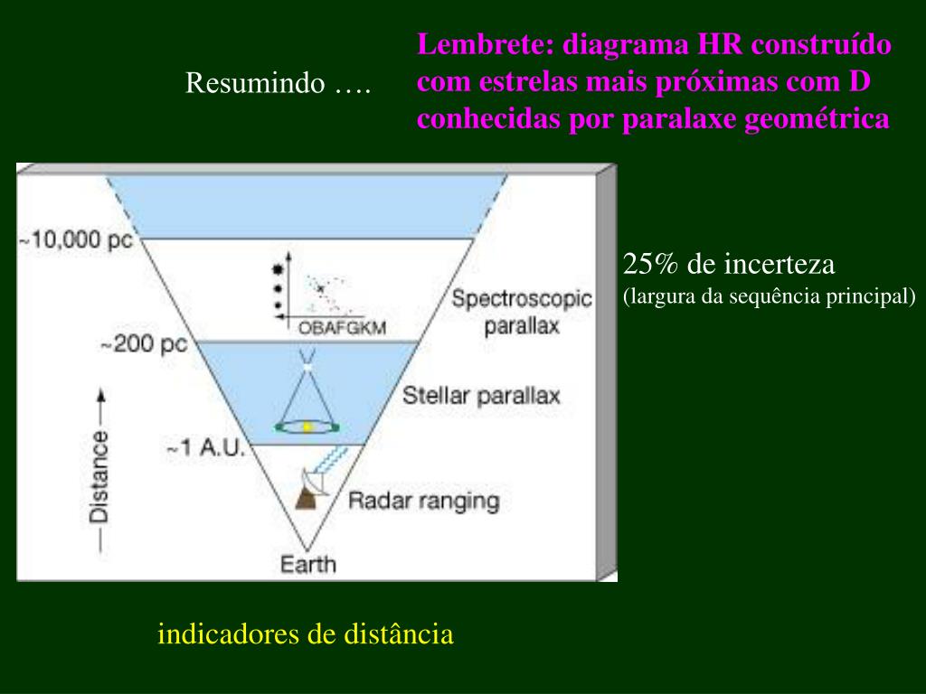 Lembrete: diagrama HR construído com estrelas mais próximas com D conhecidas por paralaxe geométrica Resumindo …. 25% de incerteza (largura da sequência principal) indicadores de distância