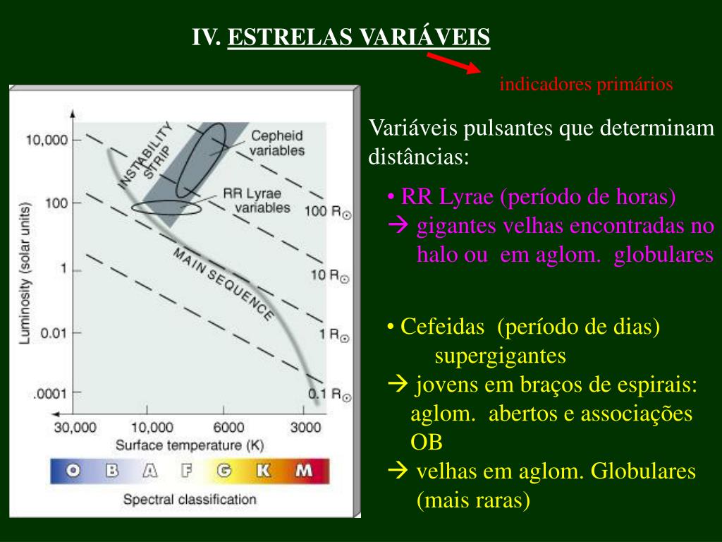 IV. ESTRELAS VARIÁVEIS indicadores primários Variáveis pulsantes que determinam distâncias: • RR Lyrae (período de horas) • gigantes velhas encontradas no • halo ou em aglom. globulares • Cefeidas (período de dias) • supergigantes • jovens em braços de espirais: • aglom. abertos e associações • OB • velhas em aglom. Globulares • (mais raras)