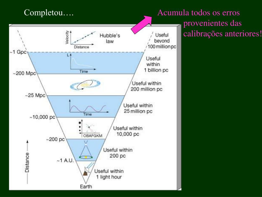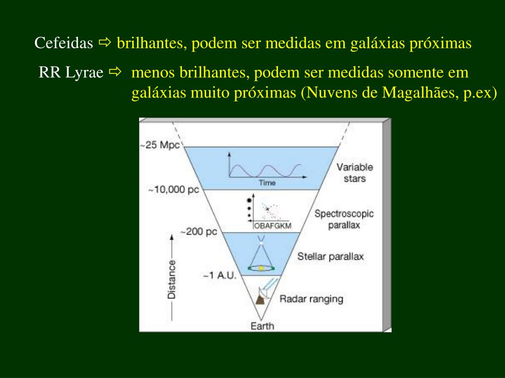 Cefeidas brilhantes, podem ser medidas em galáxias próximas RR Lyrae menos brilhantes, podem ser medidas somente em galáxias muito próximas (Nuvens de Magalhães, p.ex)