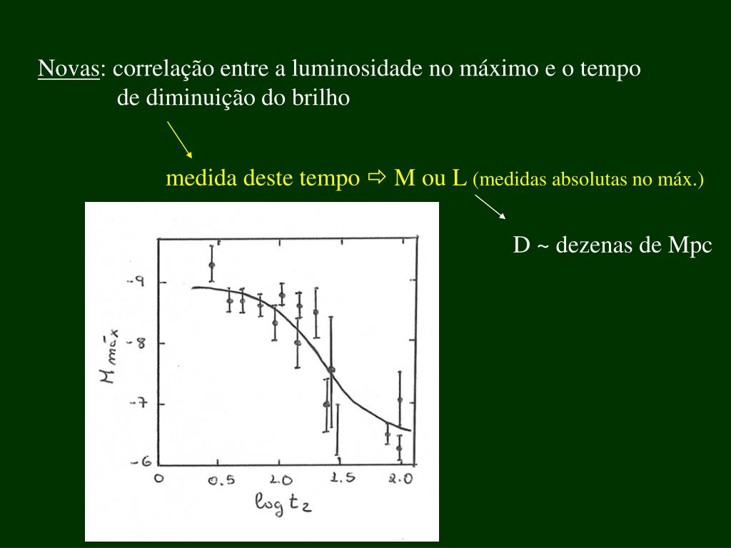 Novas: correlação entre a luminosidade no máximo e o tempo de diminuição do brilho medida deste tempo M ou L (medidas absolutas no máx.) D ~ dezenas de Mpc