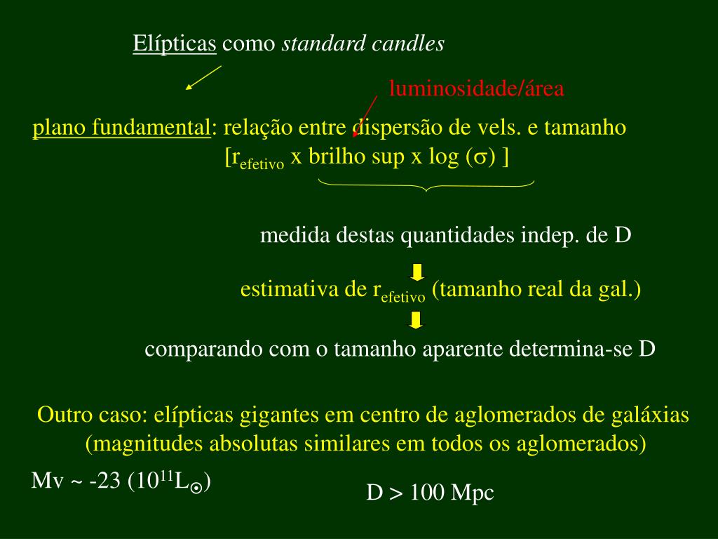 Elípticas como standard candles luminosidade/área plano fundamental: relação entre dispersão de vels. e tamanho [refetivo x brilho sup x log () ] medida destas quantidades indep. de D estimativa de refetivo (tamanho real da gal.) comparando com o tamanho aparente determina-se D Outro caso: elípticas gigantes em centro de aglomerados de galáxias (magnitudes absolutas similares em todos os aglomerados) Mv ~ -23 (1011L) D > 100 Mpc