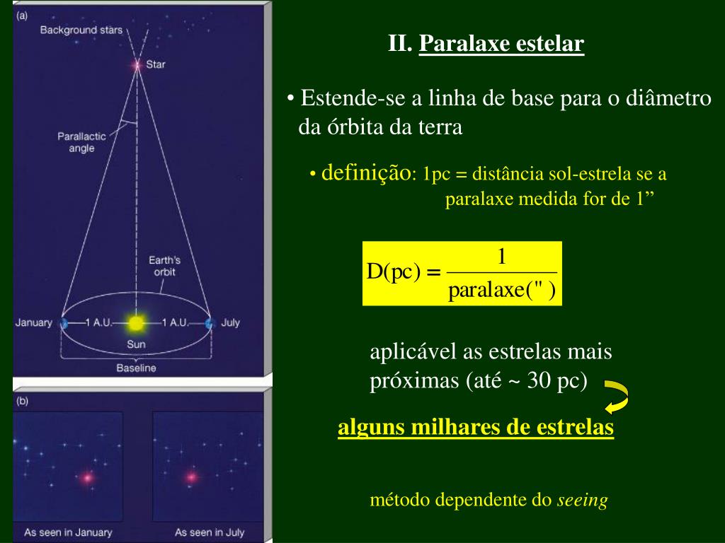 II. Paralaxe estelar • Estende-se a linha de base para o diâmetro • da órbita da terra • definição: 1pc = distância sol-estrela se a • paralaxe medida for de 1” aplicável as estrelas mais próximas (até ~ 30 pc) alguns milhares de estrelas método dependente do seeing