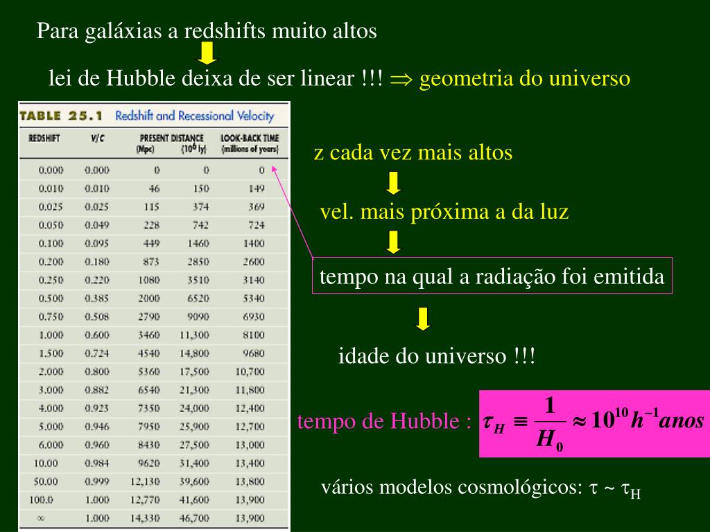 Para galáxias a redshifts muito altos lei de Hubble deixa de ser linear !!! geometria do universo z cada vez mais altos vel. mais próxima a da luz tempo na qual a radiação foi emitida idade do universo !!! tempo de Hubble : vários modelos cosmológicos: ~ H