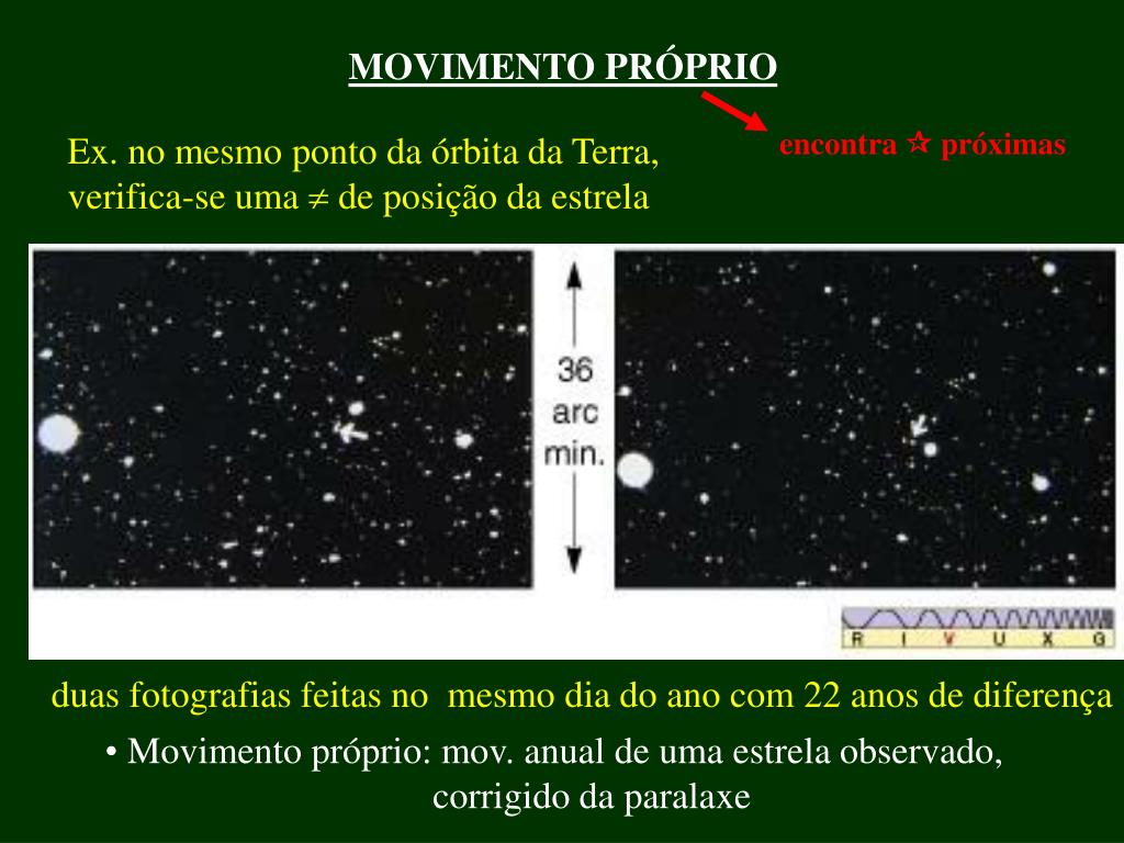 MOVIMENTO PRÓPRIO encontra próximas Ex. no mesmo ponto da órbita da Terra, verifica-se uma de posição da estrela duas fotografias feitas no mesmo dia do ano com 22 anos de diferença • Movimento próprio: mov. anual de uma estrela observado, • corrigido da paralaxe