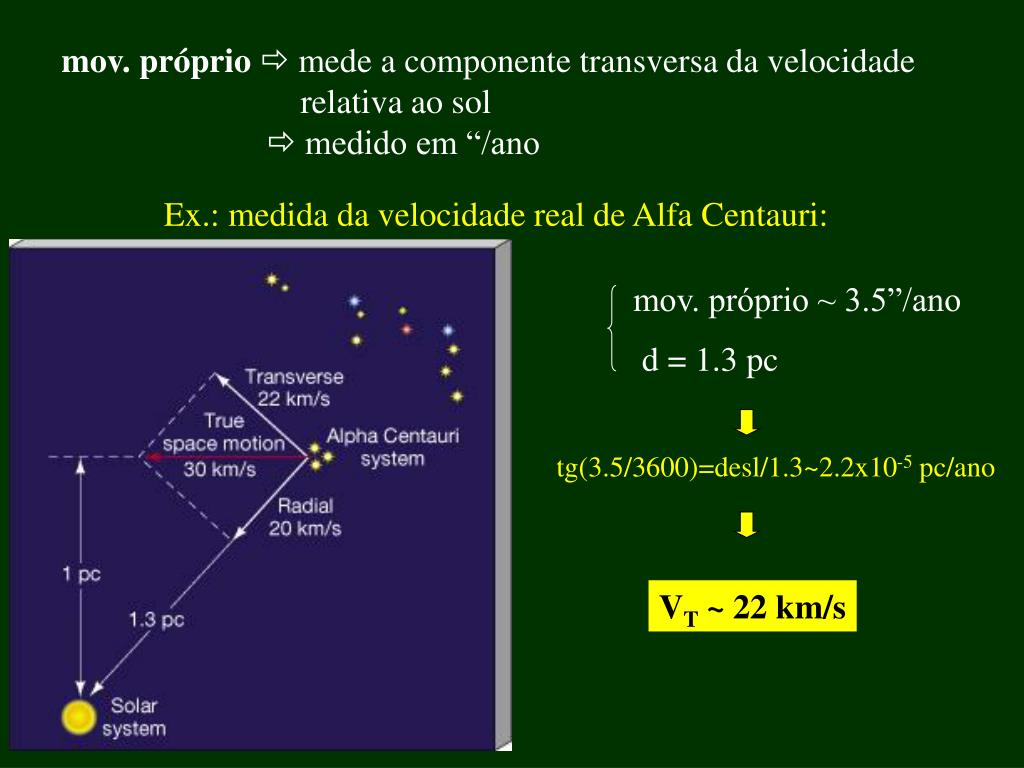mov. próprio mede a componente transversa da velocidade relativa ao sol medido em “/ano Ex.: medida da velocidade real de Alfa Centauri: mov. próprio ~ 3.5”/ano d = 1.3 pc tg(3.5/3600)=desl/1.3~2.2x10-5 pc/ano VT ~ 22 km/s