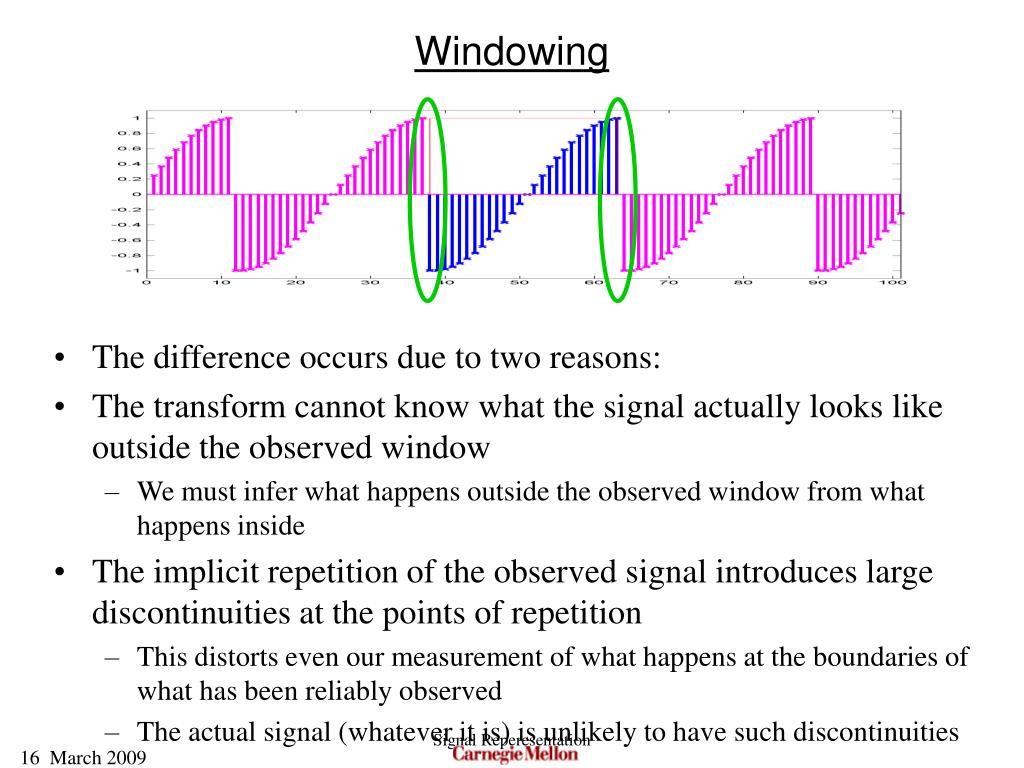 Windowing • The difference occurs due to two reasons: • The transform cannot know what the signal actually looks like outside the observed window • We must infer what happens outside the observed window from what happens inside • The implicit repetition of the observed signal introduces large discontinuities at the points of repetition • This distorts even our measurement of what happens at the boundaries of what has been reliably observed • The actual signal (whatever it is) is unlikely to have such discontinuities Signal Reperesentation