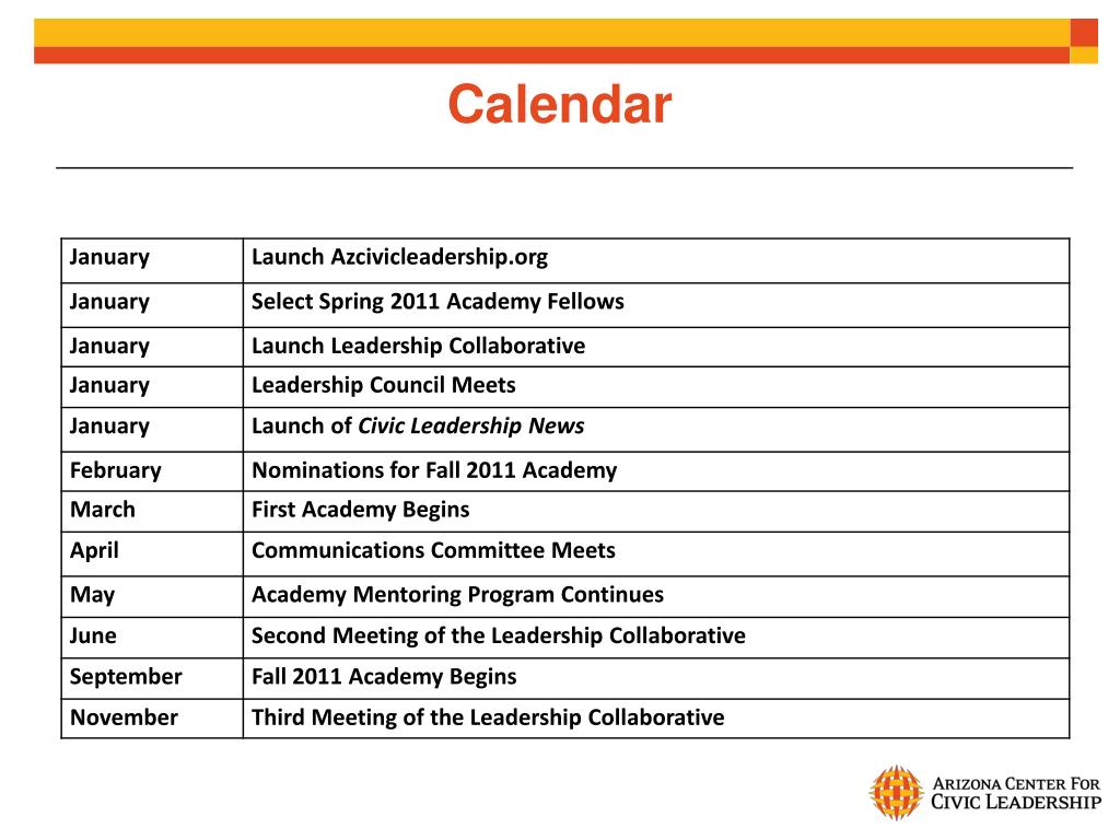 Arizona Civic Leadership Collaborative . 1/13/2011. ARIZONA CENTER FOR CIVIC LEADERSHIP. CIVIC LEADERSHIP ACADEMY. STATEWIDE COLLABORATIONS. COMMUNITY OUTREACH AND CITIZEN EDUCATION. Three Components. Leadership Council. Advise the Arizona Center for Civic Leadership