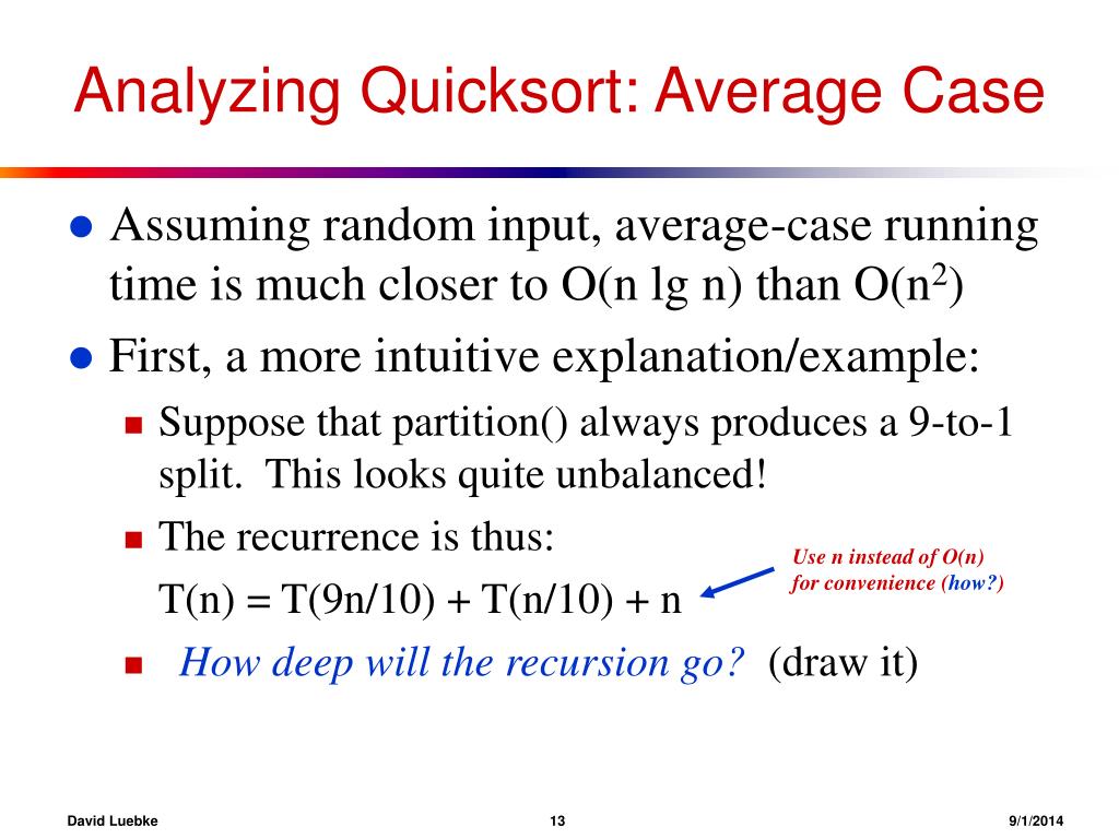 Analyzing Quicksort: Average Case • Assuming random input, average-case running time is much closer to O(n lg n) than O(n2) • First, a more intuitive explanation/example: • Suppose that partition() always produces a 9-to-1 split. This looks quite unbalanced! • The recurrence is thus: T(n) = T(9n/10) + T(n/10) + n • How deep will the recursion go?(draw it) Use n instead of O(n) for convenience (how?) David Luebke 139/1/2014