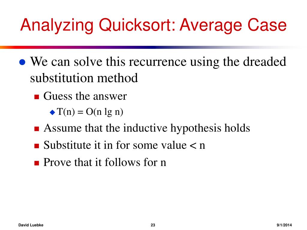 Analyzing Quicksort: Average Case • We can solve this recurrence using the dreaded substitution method • Guess the answer • T(n) = O(n lg n) • Assume that the inductive hypothesis holds • T(n) an lg n + b for some constants a and b • Substitute it in for some value < n • What value? • Prove that it follows for n David Luebke 269/1/2014