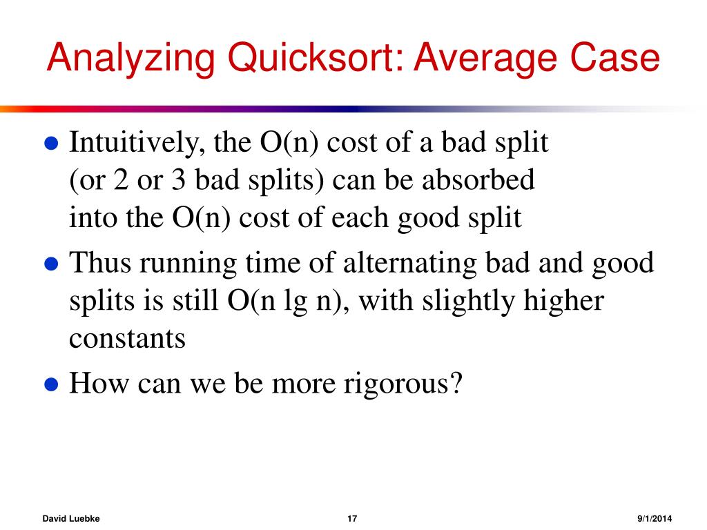 Analyzing Quicksort: Average Case • Intuitively, the O(n) cost of a bad split (or 2 or 3 bad splits) can be absorbed into the O(n) cost of each good split • Thus running time of alternating bad and good splits is still O(n lg n), with slightly higher constants • How can we be more rigorous? David Luebke 179/1/2014